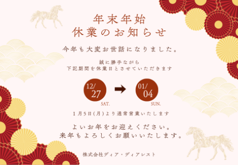 誠に勝手ながら、2025年12月27日(土)~2026年1月4日(日)迄の期間、
